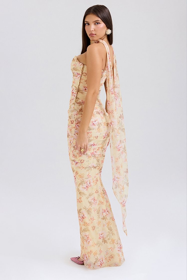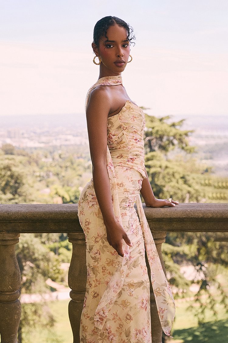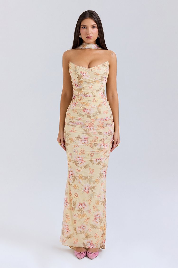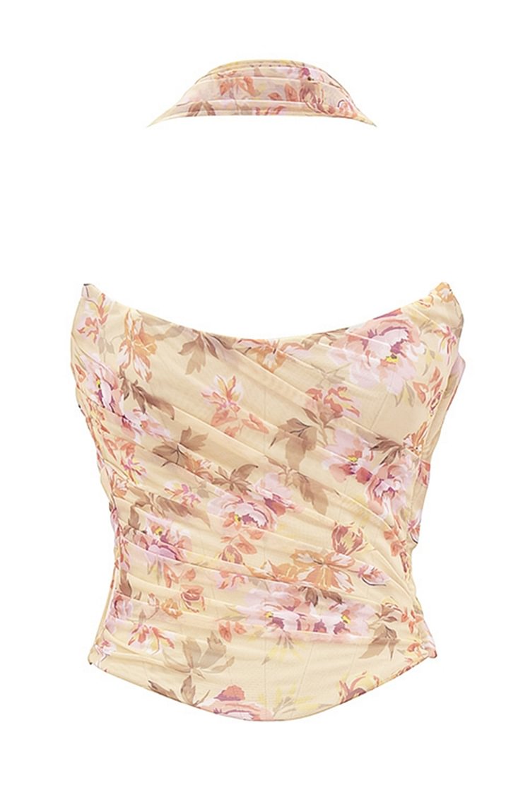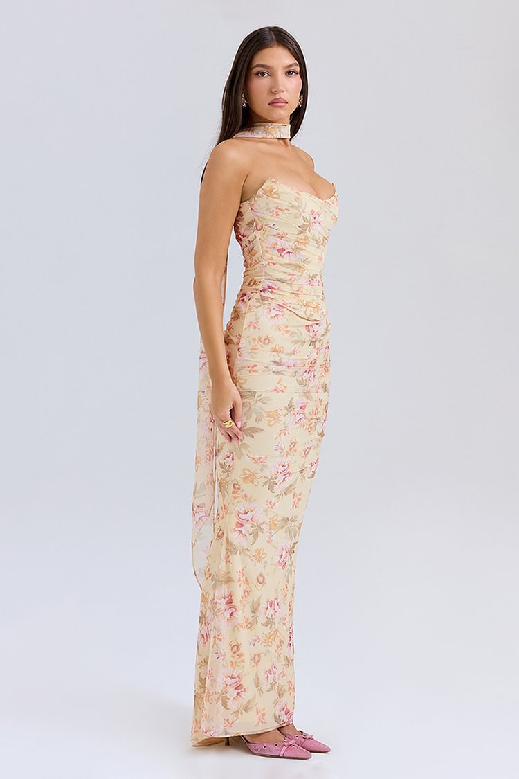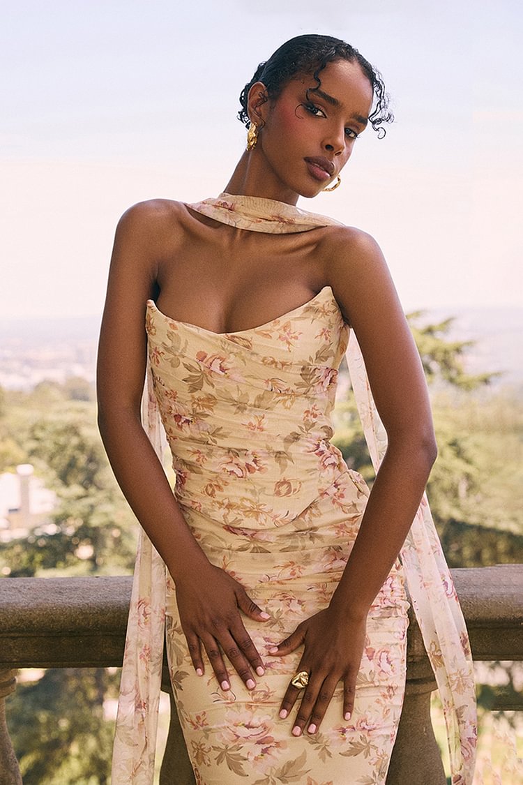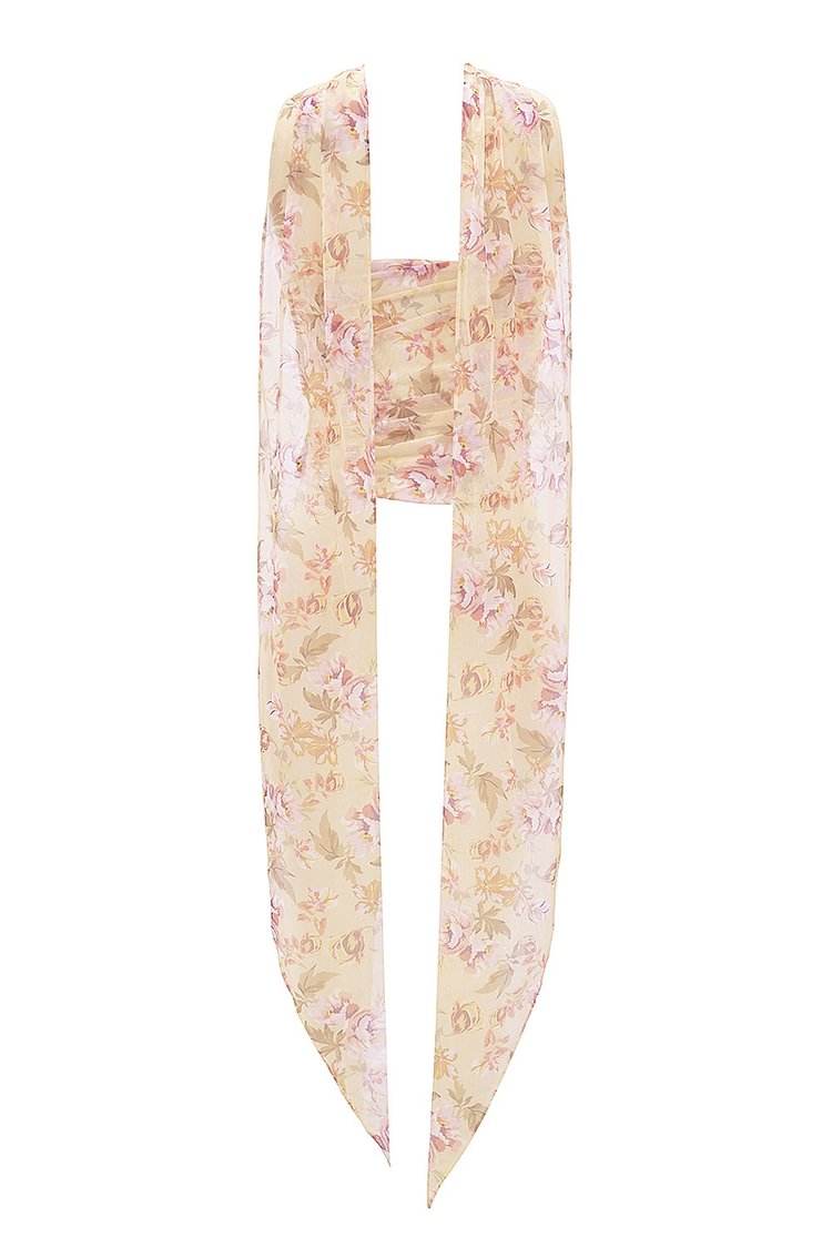 Our romantic date-night corset that looks so beautiful paired with our maxi skirt. Made from stretch mesh, it has a strapless neckline and the bodice is fully corseted to cinch and shape your waist. The pretty gathering creates that ultra soft and feminine vibe and we adore the neck scarf that trails for added drama.