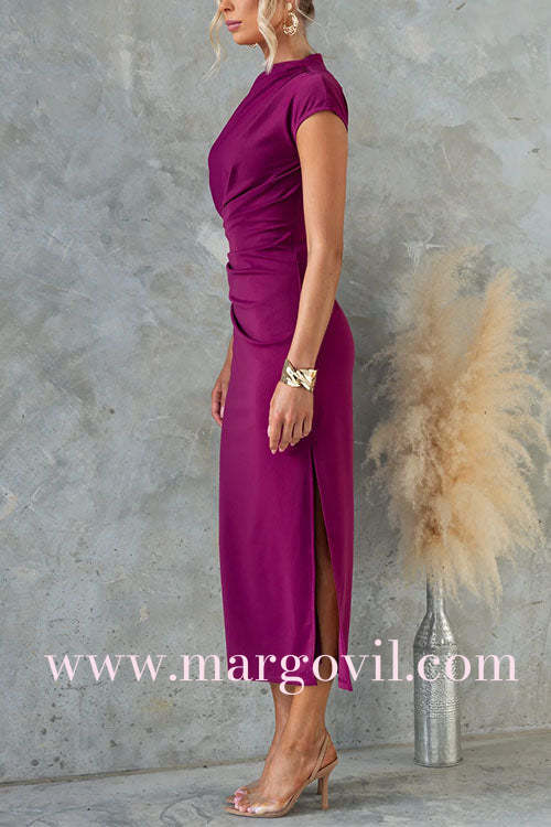 Experience the perfect combination of elegance and sexiness with our Ruched Cap Sleeve Side Slit Bodycon Midi Dress. Its ruched cap sleeves and side slit design enhance your curves, while the midi length adds a touch of sophistication. Be the center of attention at any event with this dress!